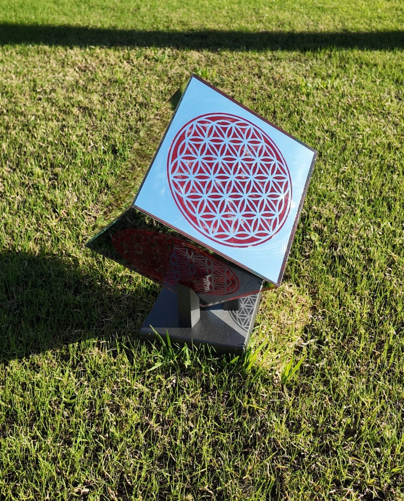 Mirror Sculpture featuring the Flower of Life etched in single layer mirror. The glass portion measures 9.5 x 9.5 x 9.5 “. The base measures 6 x 6.