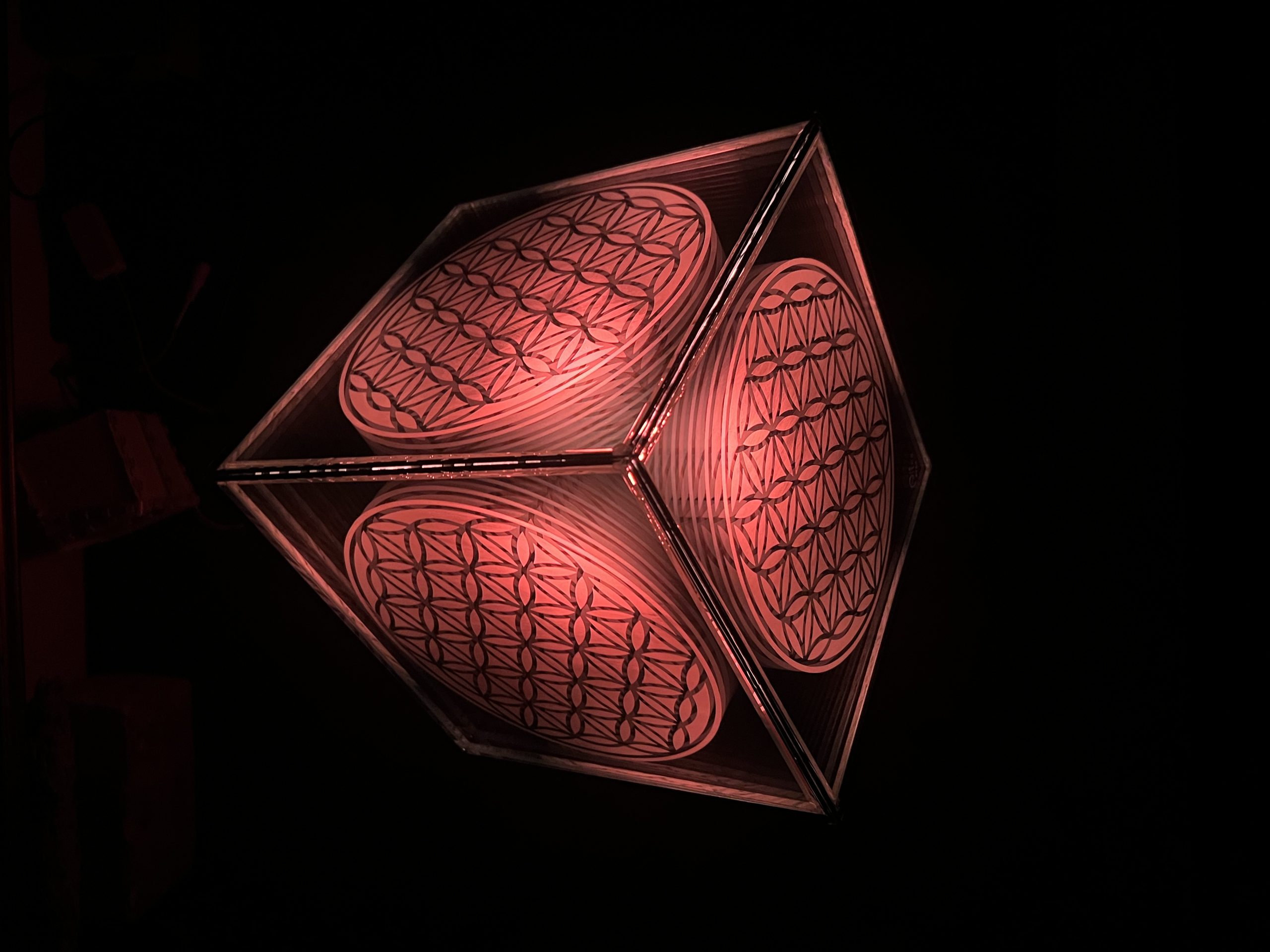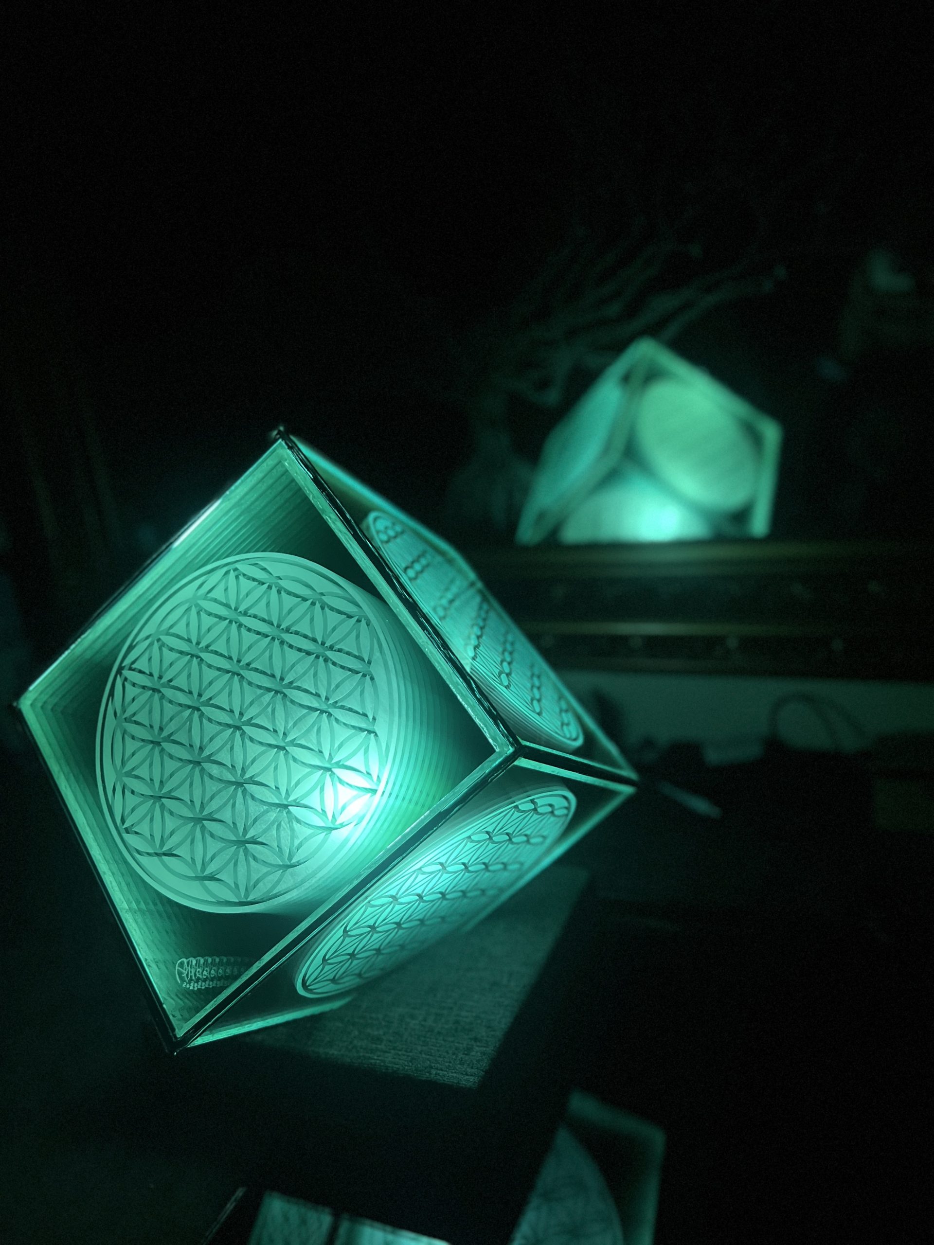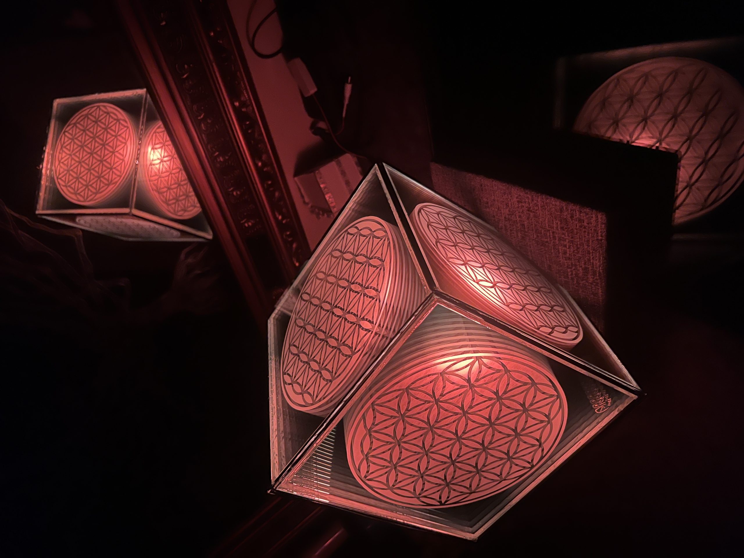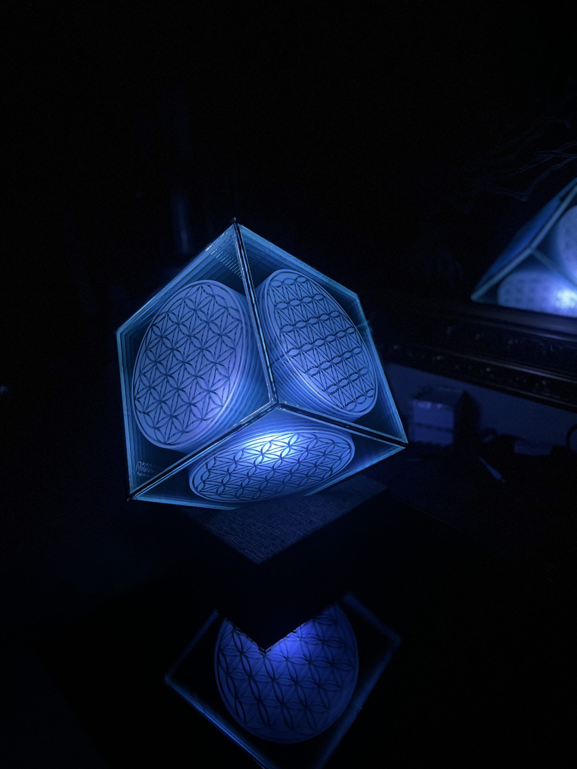 One of One. Infinity Mirror Sculpture featuring the Flower of Life etched double layer mirror. The glass portion measures 9.5 x 9.5 x 9.5 “. The base measures 9.5 x 9.5. The light source is a smart life bulb, fully controllable, dimmable, with timer. Plugs into the wall.